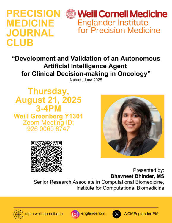 Englander Institute for Precision Medicine Journal Club Development and Validation of an Autonomous Artificial Intelligence Agent for Clinical Decision-making in Oncology Published June 6, 2025 Nature Presented by Bhavneet Bhinder, MS Senior Research Associate in Computational Biomedicine Institute for Computational Biomedicine Thursday, August 21, 2025 3:00 – 4:00 PM ET Weill Greenberg, 13th Floor, Y1301 https://weillcornell.zoom.us/j/92600608747 Zoom Meeting ID: 926 0060 8747